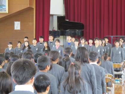 卒業生も在校生に負けない声で 感謝の思い、在校生にたくす思いをこめ・・・・。