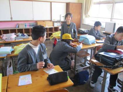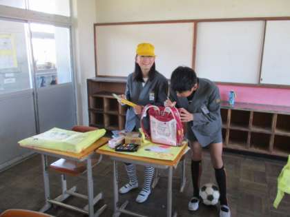 写真中・下 朝早くから来て、ランドセルや帽子にお互い思い出のメッセージを書きあいしています。