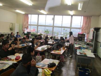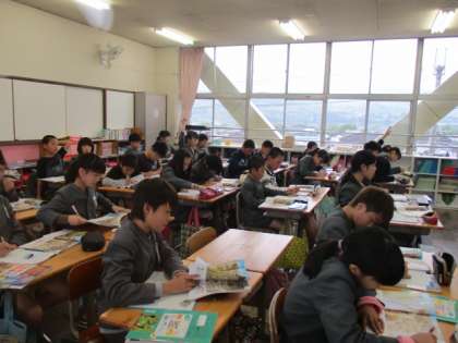P10・11を見て 土器・やぐらなどがある。狩りや漁をしている・・・など、教科書を見ながら気付いたことを出し合っています。