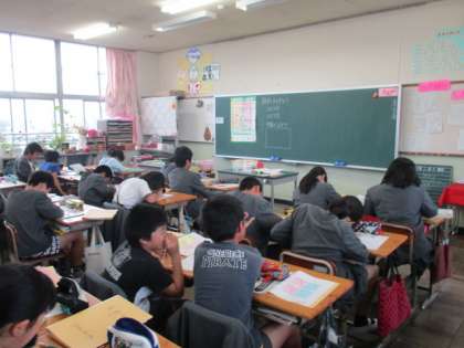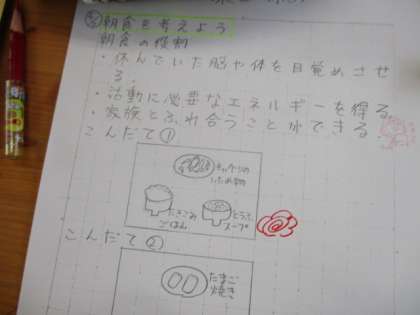 「朝食のおかず作り」こんだて、今朝のこんだてなどワークシートに記入しています。