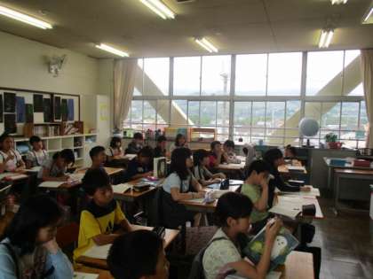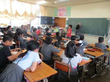 写真上 5A 学級会 運動会スローガンについて考えています。