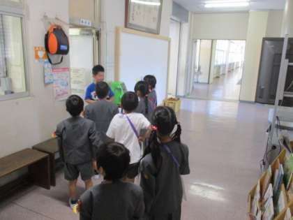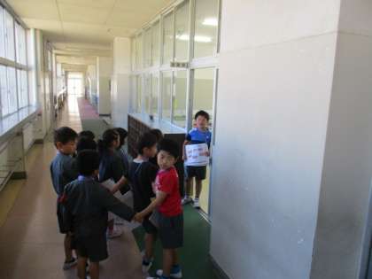 皐月 12日(木) 2年生 公開日 2016/05/12 更新日 2016/05/12 2年生 5月12日(木) 2A 2A 「がっこうをあんないしよう」 赤い先導うちわをもち、手をつなぎ、やさしく誘導してあげながら各教室をまわりました。各部屋では、自分たちが調べたことを書いた画用紙を使って説明したり、実際にそばに行って説明したりしています。2年生としてのリーダーシップを発揮し、学校全体を案内します。 「1年の違いですが、たのもしく感じました。」 いいね(0)