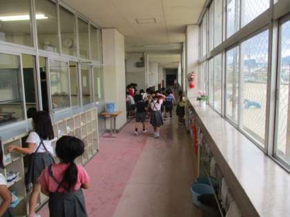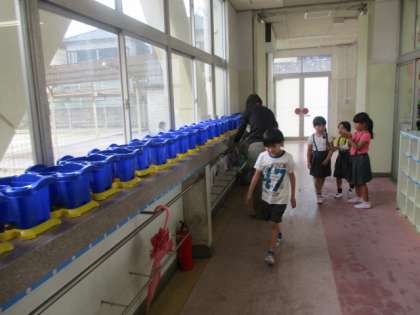 写真下 廊下の植木鉢は、あす1Bがあす「あさがお」を植えます。雨が心配です。
