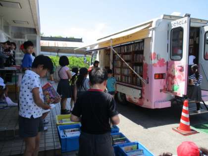 バスの中も、貸し出し・返却の列もいっぱいです。「どんな本を借りているのかな?」