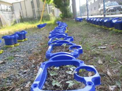 写真 1年生が植えたあさがおです。しっかり二葉が出てきています。
