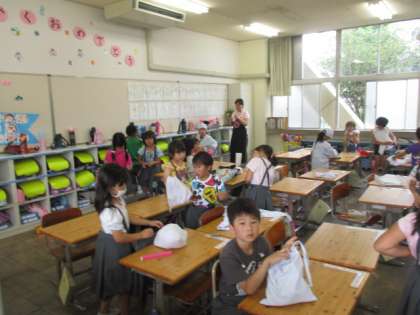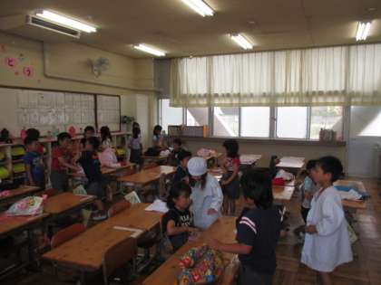給食準備が始まりました。運動会練習後で汗びっしょり、きちんと手を洗い、エプロンを着けて準備OK。