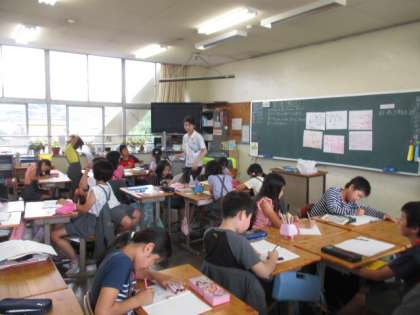 グループで考え、ホワイトボードに書いて発表し、みんなで考えています。