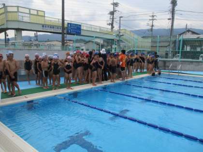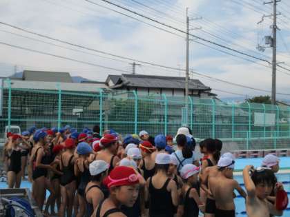 写真上中 水泳クラブ プールサイドはまさしく「猛暑」です。子どもたちは、汗だくになっての学習・委員会を終えて、プールへ。気持ちよくシャワーを浴びて練習・・・。ひとかき・ひとけり一生懸命です。
