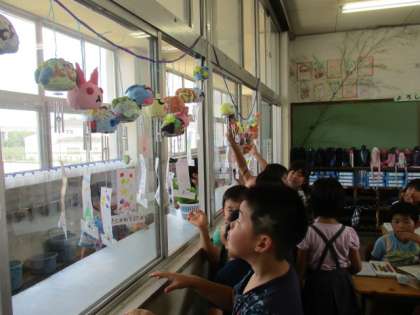 写真上中 2A 図工 風鈴も完成しました。