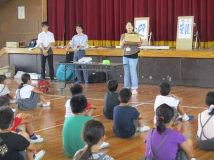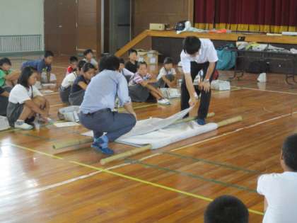 体育館に市の危機管理室(2名)から来ていただいて指導していただきました。