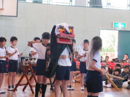 3年生 小田神楽 4グループに分かれて取り組んでいます。