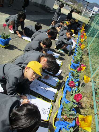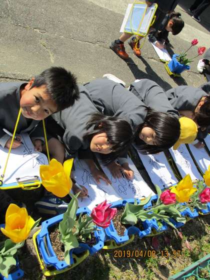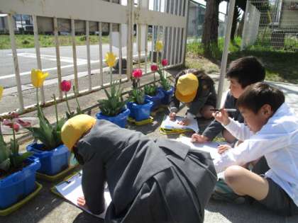 1年生の秋に球根を植えたチューリップが、春休み中からきれいに咲いていました。1年生の入学をお祝いするために、東門の近くに並べました。初めて、和紙に絵を描きました。花や葉をよく観察して、ゆっくり『カタツムリ線』で描きました。