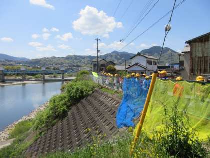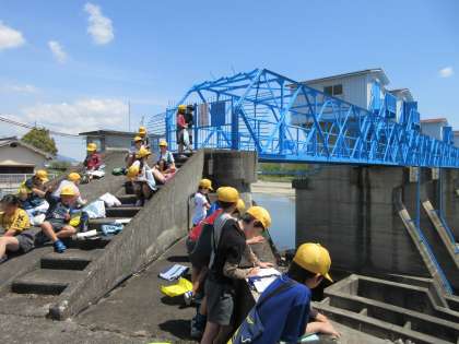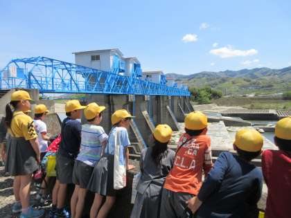 小田神社から移動して、小田井堰にやってきました。今回堰の点検ということもあり、小田井堰の敷地内に入らせていただきました。小田井堰に水はまだありませんでしたが、用水路のスタート地点であることを学びました。これからさらに詳しく学んでほしい場所です。