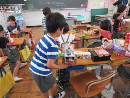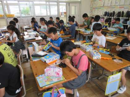 段ボールでいろいろな形を使って工作している様子や理科でゴムを使って動く車を制作している様子です。