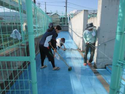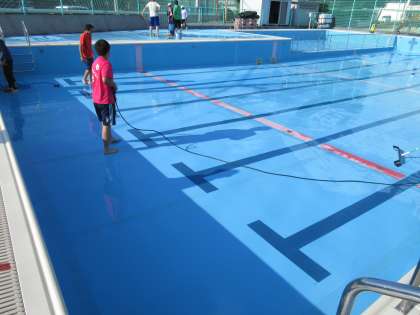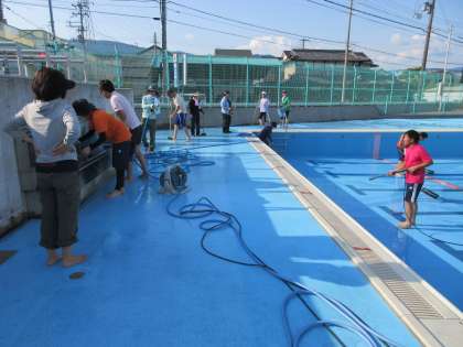 放課後は、教職員がプール清掃の最後の仕上げをしてくれました。