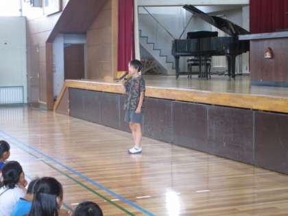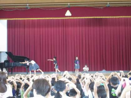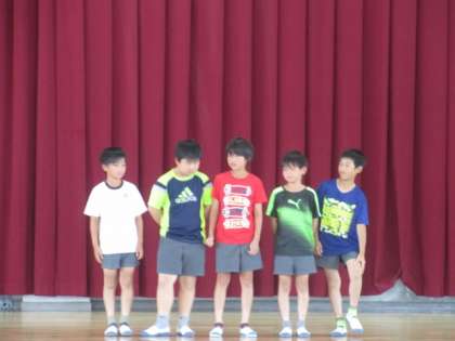 児童会主催のプール開き集会が、表彰伝達のあと行われ、児童会が中心となって、はむすたあの文字を使って劇をしたり、インタビューをしたりしながら、水泳についての注意事項を伝えていました。