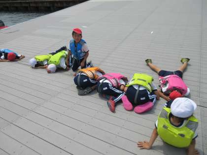 体験の様子です。床にへばりついて、魚を見ています。教員も体験させていただきました。