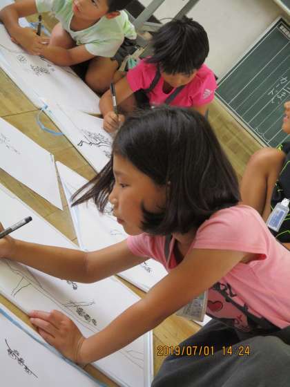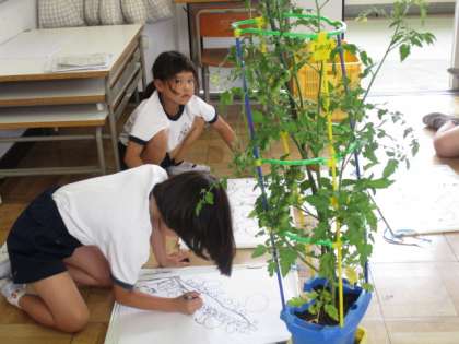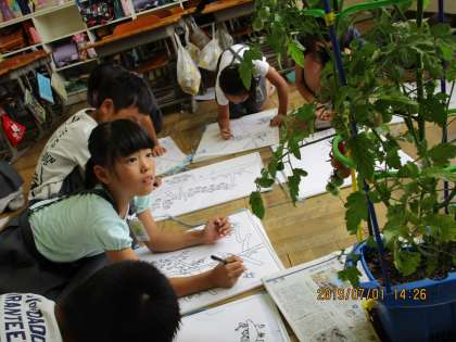 図工の時間に、生活科の学習で育てているミニトマトの絵を描きました。鉢のまわりを囲んで、実の付き方や葉の形をじっくり観察しました。それから、和紙に筆ペンで描きました。真剣な表情で、取り組んでいました。