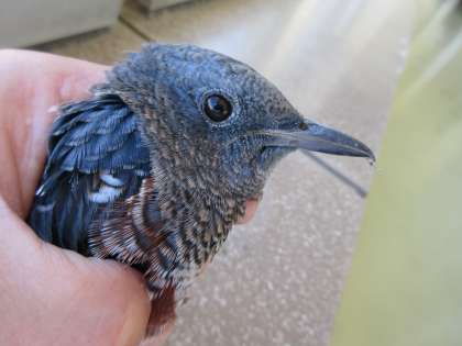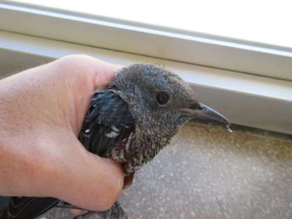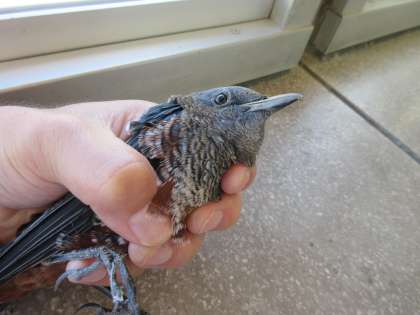 イソヒヨドリが2階廊下に迷い込んできました。脱出するのに困っていたので、捕まえて、3年生の児童とともに、外に逃がしてあげました。