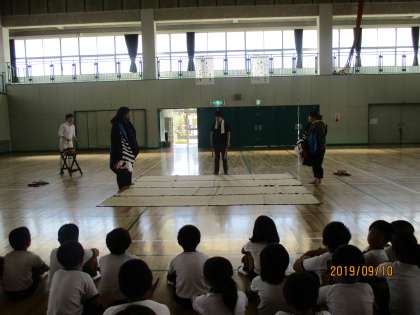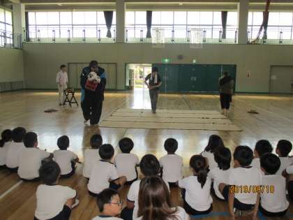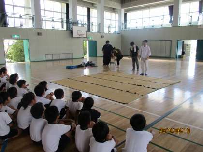 今日は小田神社で行われる神楽の練習を小田神楽の代表の方々に来ていただき、練習を行いました。実際にお手本を見せていただいたり、楽器のリズムの取り方や神楽の動き方について、丁寧に教えていただきました。午後の体育館の暑い中、子供たちは喜びながら練習に取り組んでいました。