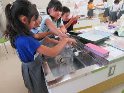 2年生では、1リットルの水の量を推測で、ナイロン袋に入れる活動をしていました。ぴったり1リットルの水を入れることができましたか?