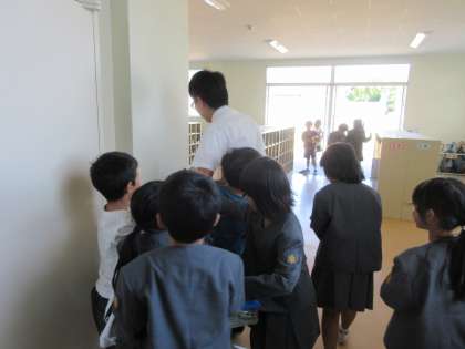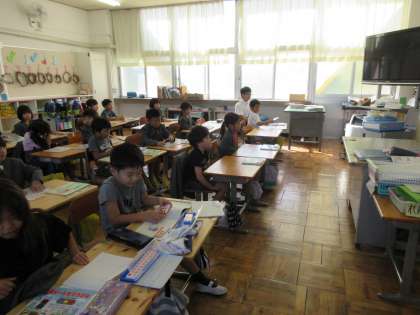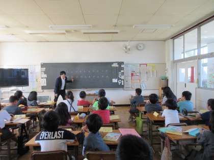 本日の授業の様子です。高野口中学校から職場体験に来ています。一年生の児童たちに引っ張りだこになっています。がんばってね。