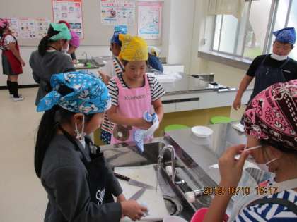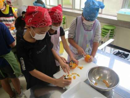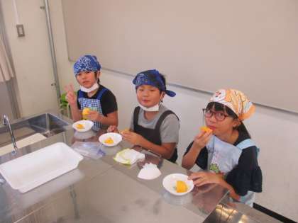 今日は和歌山県の特産物である柿の学習をしました。皮をむいて、四つに切り、二切れはその場でおいしくいただきました。残り二切れは柿ジャムにして、来週いただく予定です。ピーラーや包丁を使う様子にハラハラする場面もありましたが、誰も怪我することなく楽しく実習を終えられました。