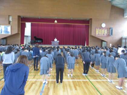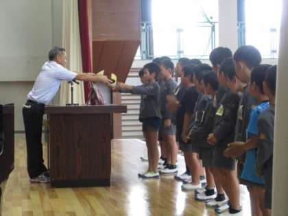 一学期終業式 公開日 2019/10/11 更新日 2019/10/11 行事等 本日、一限目に一学期終業式を行いました。一学期間を振り返って、応其小のすばらしいところや心がけたいところについて話をさせていただきました。今回の振り返りをもとに、また二学期もがんばってください。また野球クラブの表彰も併せてしました。おめでとう。 いいね(0)