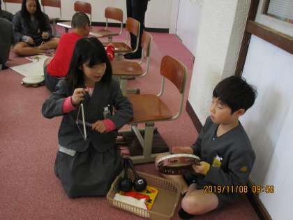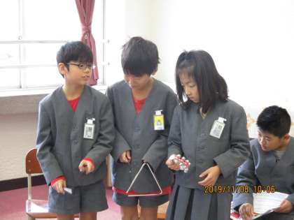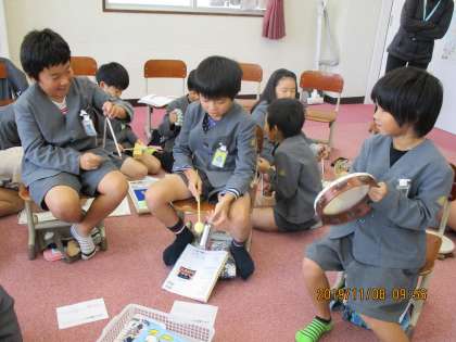音楽科では今「おかしのすきなまほう使い」の内容を進めています。魔法をかける時のの音をどのようなものにするか、チームで話しながら試行錯誤していました。色々な楽器の様々な音にふれあうことができました。