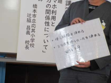 今回は、スマホと学力の関係について、データを用いながら、6年生児童と保護者のみなさんを対象に説明をさせていただきました。少しでもスマホやラインの長時間使用の危険性について気付いてくれて、自分をコントロールする行動につながってくれればいいなと思います。すべては、自分事として、自分のためにとる行動です。また、お家でもじっくりと話し合っていただくことを願っています。保護者の皆さま、本日は最後までお付き合いいただき本当にありがとうございました。