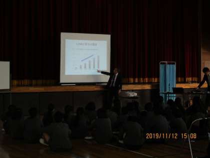 教育講演会の一部の紹介です。LINEの長時間使用で、成績はどんどん下がっていき、2時間学習しても、その学習効果が消えてしまうというデータがあります。長時間の使用は禁物です。