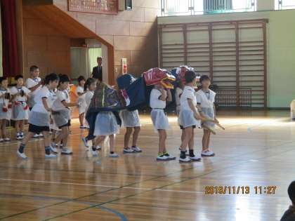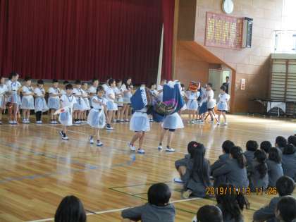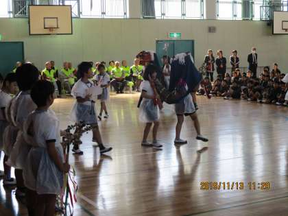 本日、朝の登校時の交通安全を見守って下さている地域の方々との交流会を行いました。3年生は小田神楽の舞を発表しました。