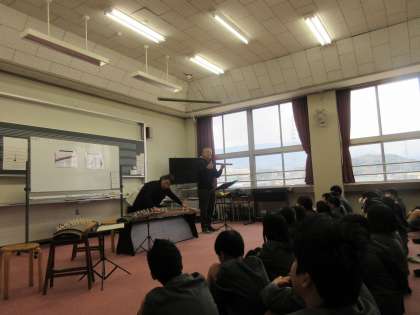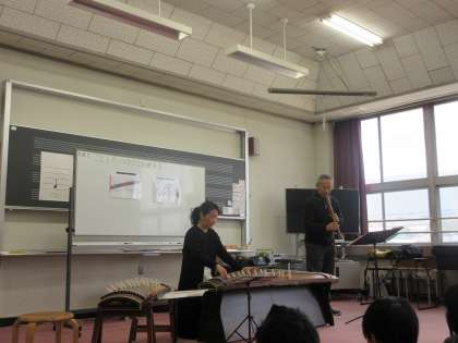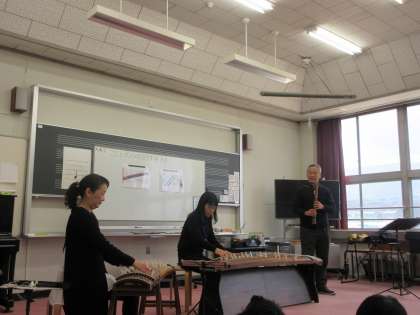 本日、6年生を対象に、ゲストティーチャー2名に来ていただき、尺八と琴の演奏を聴かせていただきました。音楽の先生も入り、すごいサウンドを聴かせていただきました。また、これからも和楽器に興味をもち、和楽器のもつすばらしさを外国の方々にも伝えていきたいものです。