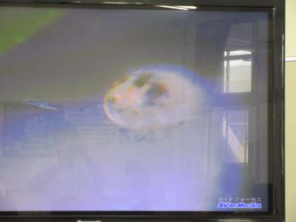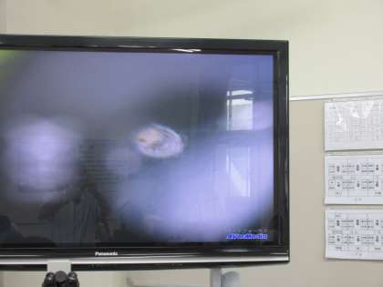 顕微鏡で見たメダカの卵をテレビに映し出しました。すごくよく見えます。命の神秘です。
