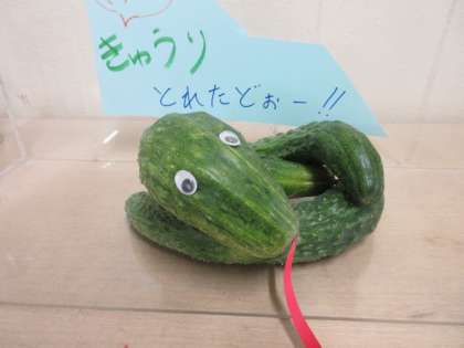 採れたてのキュウリを使って、校務員さんが制作してくれました。なかなかのアイデアです。