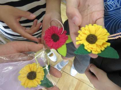 朝の登校時に、更生保護女性会高野口分会の方々にお世話になり、手作りのかわいい花の飾りをいただきました。ありがとうございました。