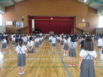 本日は、夏休み明けということで、間隔をとって体育館で集会を行いました。暑かったけど、みんなきちんと学校長の話を聞くことができました。また、転入生が3年生に来て、立派な自己紹介をみんなの前でしてくれました。応其小の仲間として、ともに学ぼう。