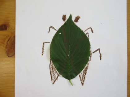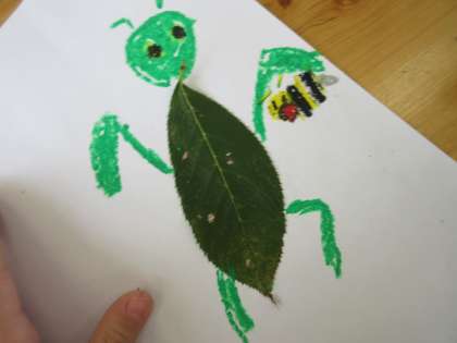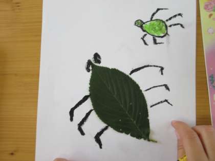 続きです。一年生、さくらの葉を使った虫の絵です。どの絵もアイデアがおもしろく、かわいく描けています。