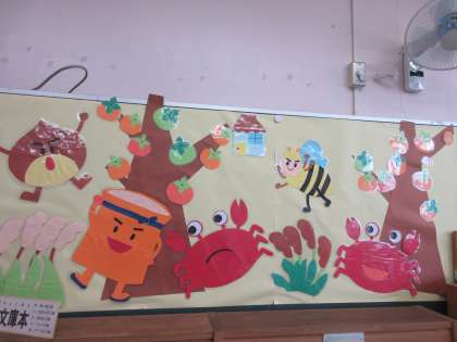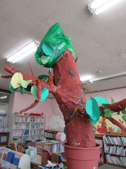 第1図書室の掲示物が新しくなりました。さるかに合戦の様子です。図書ボランティアさんの作品です。だんだん楽しい図書館になってきました。児童のみなさん、たくさん読書をしてくださいね。夏の木も、秋バージョンに変身する予定です。