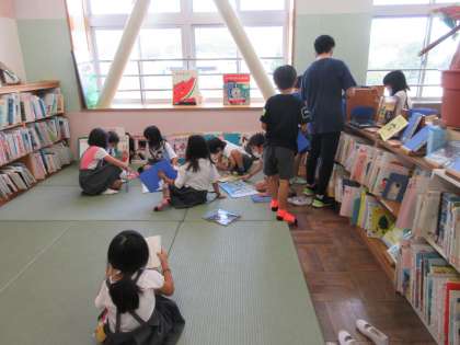 図書室で、本を選んで借りる様子です。本選びを楽しんでいます。