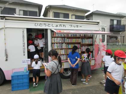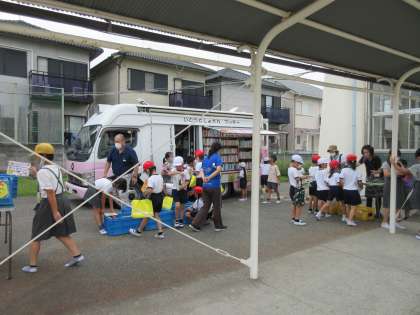 ブッキー号の来る日で、たくさんの児童が本を借りていました。読書をいっぱい楽しんでください。