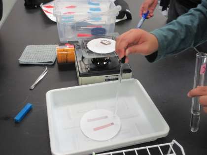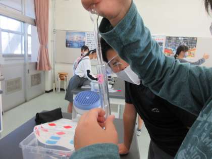今日の授業の様子です。まずは、6年生理科の実験から。テーマは「水溶液の仲間分け」です。