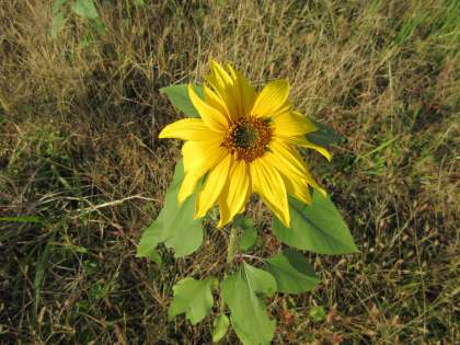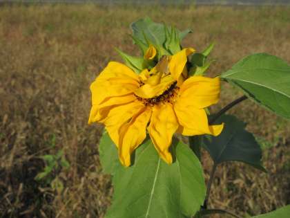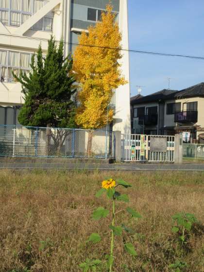 ハート型ひまわり畑で、落ちた種が芽を出し、大きくなって、ついに花が咲きました。背景にあるイチョウの色とマッチしています。