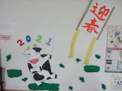 写真は、職員室前の掲示板です。新春バージョンになっています。かわいい牛の絵が素敵です。モーしぶんないですね。さあ、2021年もしっかりとがんばろう!