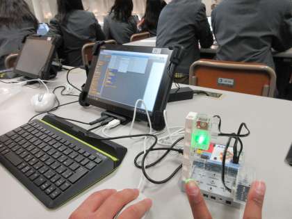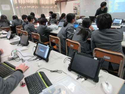 5年生、プログラミングの授業の様子です。外部から講師先生が来てくださり、指導していただきました。作っているのは、点滅信号機です。みんな上手にプログラミングしていました。