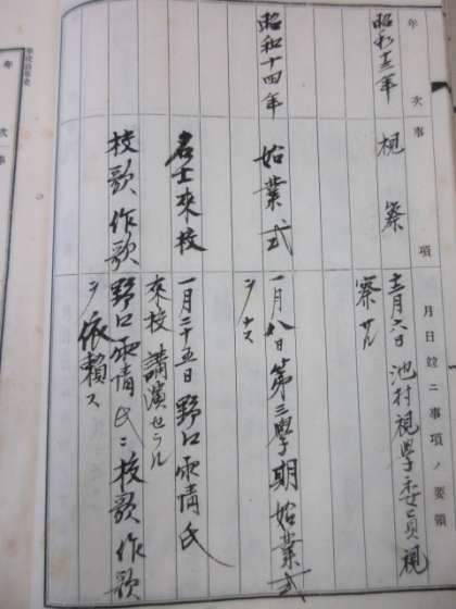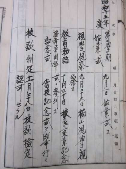 昔の沿革史を見ていると、校歌制定についての記述がありました。作詞家 野口雨情氏に依頼したのが、昭和14年1月25日。そして出来上がって認定されたのが昭和15年11月28日でした。ちょうど80年の歴史です。今児童たちが歌っている校歌は、古い古い歴史をもっていて、80年間歌い続けられてきたものです。重みを感じます。