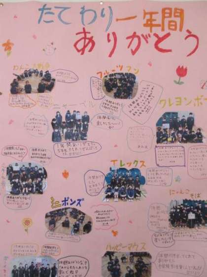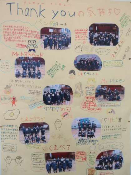 今日の掲示と縦割り活動のありがとうメッセージが児童玄関に貼られています。