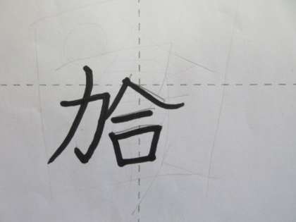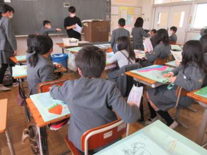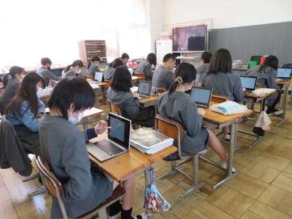 5年生の様子です。タブレットで調べ学習をしています。漢字は、児童が考えて造った漢字です。これで、力を合わせる、協力の意味だそうです。