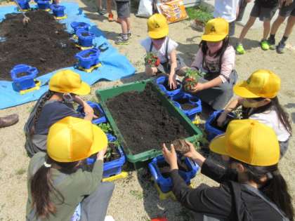 チューリップの鉢を使って、今日ミニトマトを植えました。たくさんのトマトがなるように、世話をしてやってくださいね。