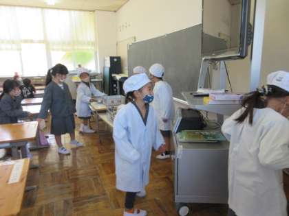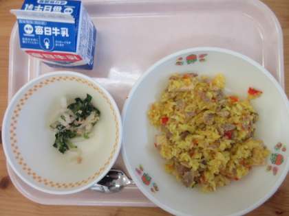 今日の給食の様子です。1年生です。今日のメニューはパエリア。